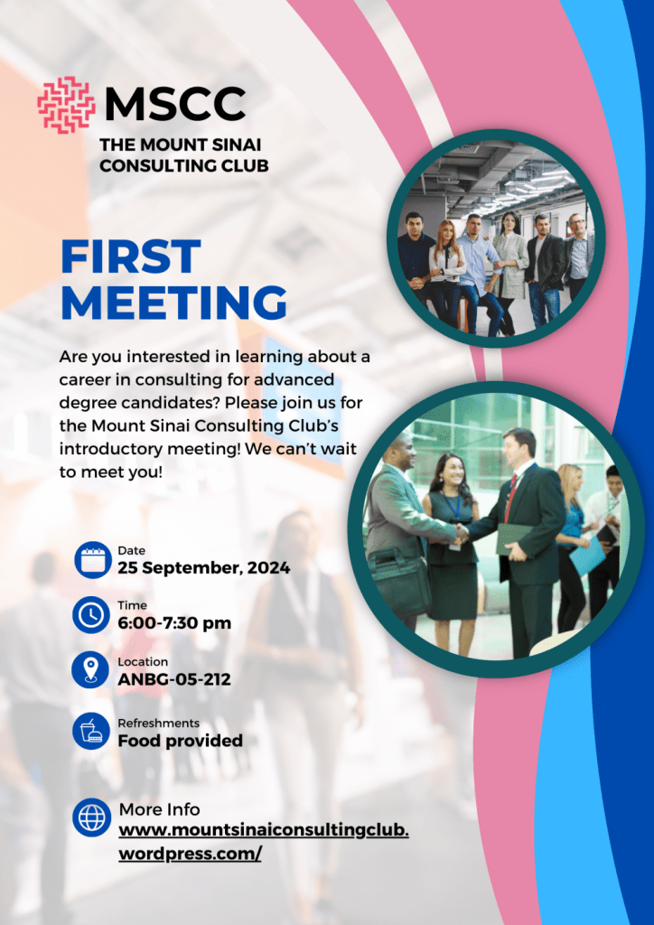 Join us for MSCC’s first meeting! You will not only get to meet our leadership team, but you will also get the opportunity to hear about open leadership roles! We understand Sinai is a diverse community that can utilize this club for various reasons. From prospective members preparing to apply for jobs to curious trainees that want to gain a working definition of what consulting is and if it is right for them. Our goal is not only to satisfy these inquiries but also to provide necessary resources to our community. During this meeting, we will be going over club structure/goals, club resources, basic principles of consulting, and future club events. We look forward to meeting you and don’t forget to RSVP!